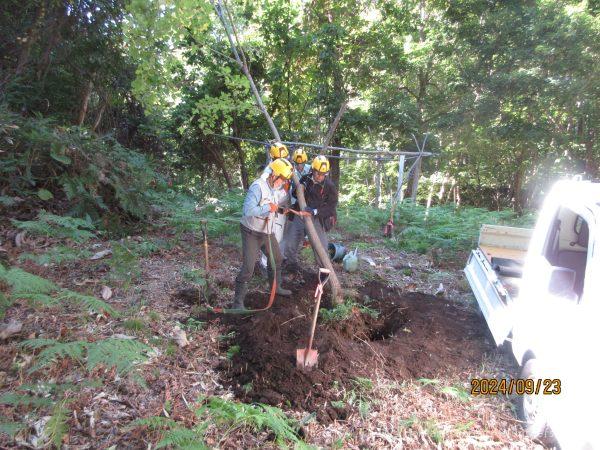 4m弱のハルニレは、事前に根切りしていたにも係わらず太い根が残っていて、結局キャリコで引っぱって何とか抜くことができました。悪戦苦闘の末、無事ワラビ畑奥に収まりました。