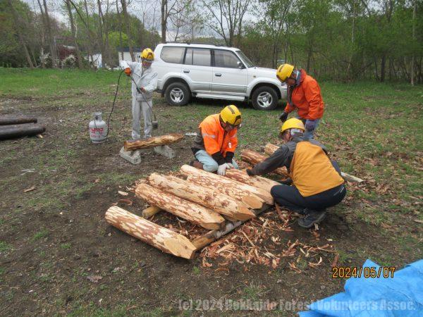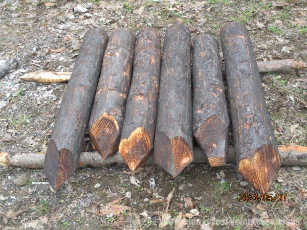 ①木道で使用する杭の腐食を防ぐ為、小笠原工芸様の敷地内で30本の杭にガスで表面焼きを行いました。