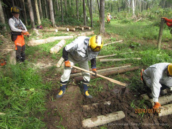 その後、会場わきの枯損木・傾斜木の処理を行いました。伐採したトドマツ8本はすべて玉切し植栽会場の腰かけに、細い部分はぬかるんだ作業道の補修に活用し、立派な会場が出来上がりました。
