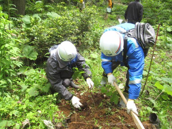 森ボラ会員11名のほか、㈱日本道路8名、シシの会3名、体験入会1名の総勢23名が参加して、ひたすら植樹活動を行いました。