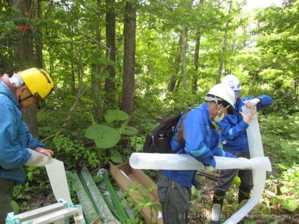 朝礼で、土の起こし方、苗の植え方、ハイトシェルター設置の仕方等のレクチャーを受けてそれぞれ植樹エリアへ移動…。