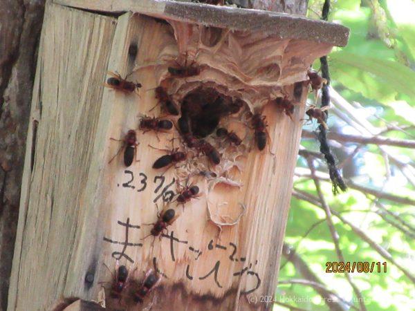おまけ:集合場所付近に設置した巣箱を蜂が占拠していました。蜂の駆除は危険と判断して近くに蜂危険の杭を立てましたのでご注意下さい