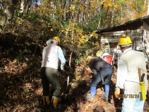 午前中は体験を含む3名が活動地を回りキノコ(ナメコが多かった)を採取し、他の全員が澄川南小学校の枯れてしまった記念樹(イタヤ楓)を小屋前のイタヤ楓に植え替えました。