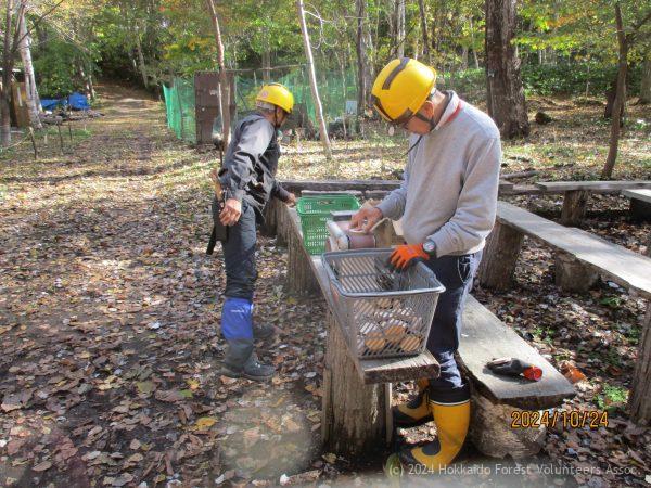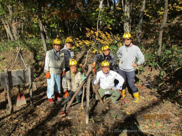 昼からは全員で苗畑の網を支える支柱の交換に備えて支柱の作製と杭の皮むきを13本行い体験の女性も最初は慣れない手つきでしたが慣れると鉈を上手く使って皮むきをし活動後の感想で「又、是非参加したい」と感想を述べていました。