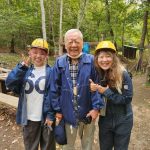 B班は57小班、54小班はC班とD班が二分して、それぞれ草を刈りながら、自生稚樹を見つけ出しマーキングと竹支柱を立てました。稚樹の本数は500本/haを目安に、成長が見込まれる稚樹を選木しました。A班は岡村先生と協会員が各班を回り、活動をアドバイス。
