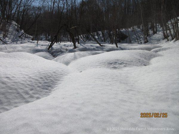 自然観察班は樹名板位置図と実際の木の位置を確認しながらキャリコ橋を渡り、樹木園を超えてA-2区で整理伐を手伝い上流橋を超えてから、雪面を歩き(雪が無ければ歩けません)ツルマサキを見て中流橋から小屋に戻りました。雪解けが進み、右精進川表面の薄氷に太陽の光が当たりキラキラと輝き、とても綺麗でそこに水芭蕉の芽が顔を出し始めました。