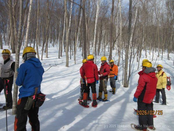 駐車場の雪もぐっと減り、日差しも暖かで絶好の森ボラ日和に15名の協会員と先日入会されたばかりの河野さんの紹介で森ボラ体験希望の女性が参加しました。