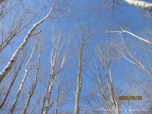自然観察班は樹名板位置図と実際の木の位置を確認しながらキャリコ橋を渡り、樹木園を超えてA-2区で整理伐を手伝い上流橋を超えてから、雪面を歩き(雪が無ければ歩けません)ツルマサキを見て中流橋から小屋に戻りました。雪解けが進み、右精進川表面の薄氷に太陽の光が当たりキラキラと輝き、とても綺麗でそこに水芭蕉の芽が顔を出し始めました。