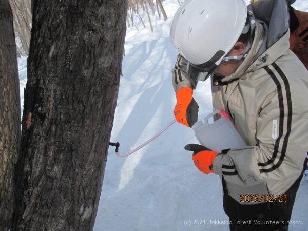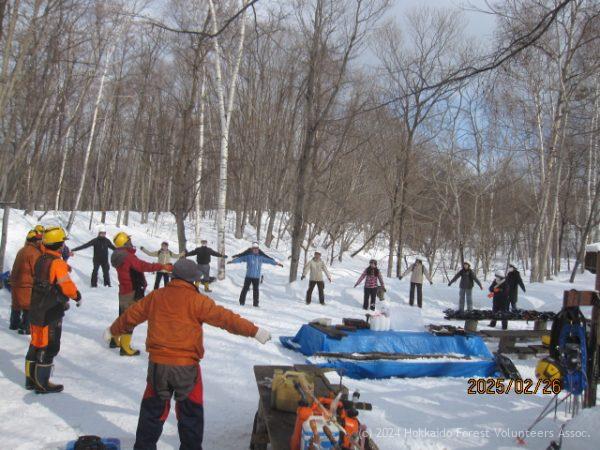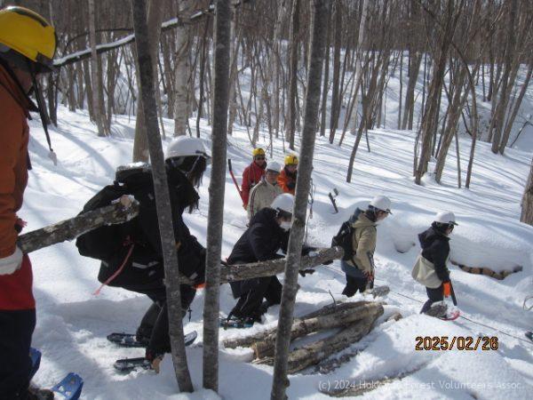 じょうてつ社員11名が冬の森に訪れました。協会員12名はE-8区で整理伐を行う班と、CSR活動のサポート班に分かれて活動しました。じょうてつの皆さんは集合場所の裏手C-2区のイタヤカエデの木にドリルで穴を開け樹液採取用のボトルを設置。その後各自ノコを持ちE-8区で整理伐を体験しました。昨年も参加された方もおり、少しコツをつかんだので冬の森の様子を堪能できたとのこと。イタヤカエデの樹液は500ml ほど集まり全員で試飲 ほんのりと甘みが感じられました。