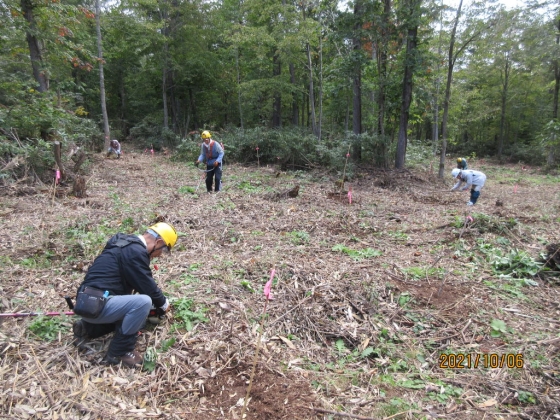 オイスカ植樹会準備 2022年10月6日 最終更新日時 : 2024年2月13日 hy 野幌国有林 トトロップの森 一気に冷え込んで寒い一日になりました。 10月8日に「オイスカ植樹会」で針葉樹、広葉樹合わせて300本の植樹を予定しています。 植樹予定場所に約80本の杭を立て前回と合わせ300本になりました。 草刈りと、杭を立てた場所の地拵えを行いました。 植栽地の地拵え 植栽場所に竹支柱設置