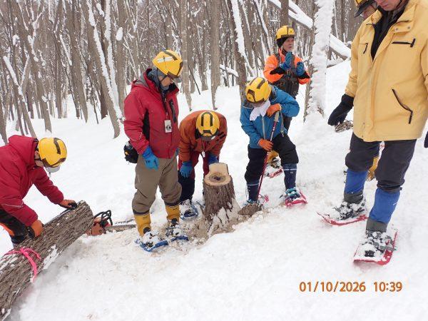 今年最初の活動は例年通り、伐採における安全確認の講習から始まりました。大窪さんがリーダーでチェーソーマンの笛と補助員の笛での合図から伐倒方向と反対側の木の陰への避難を確認して、日沼さんがチェーンソーで木を倒すと係り木にならず見事に倒れました。その後玉切りと手鋸で枝を払ってから伐採作業の反省会を行い注意事項を確認しました。