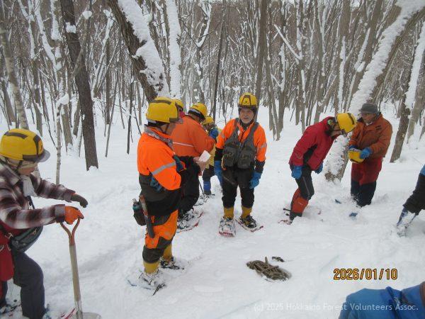 その後、小屋まで戻りA地区へ全員で向かい道具箱の確認と鹿の搬送シートを改造?した丸太搬送ソリを見てから小屋まで戻り昼過ぎに解散しました