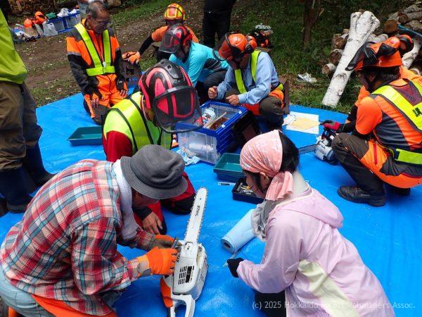 終日曇り空で気温も低く比較的活動しやすい一日でした。11名の協会員が参加し、午前中は多面事務局主催で開催されたチェーンソー操作安全講習へ4名が受講、他の協会員は2班に分かれてA-2区の整理伐材選木(約100本)、ホダ場整備・支柱交換、A-4区から運材等の作業を行い、午後からは全員でC-2区の掛り木(ミズナラ1本)の処理を行いました。