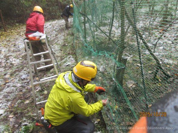 2班に分かれて、中央ギャップ地にある防獣網の補修作業と防獣網内の成長調査を実施しました。が、調査の方は既に葉が無く樹種が特定できない樹木が多く記録帳も濡れて記入出来なくなり途中で断念。避難小屋の屋根用テントを外して回収し、11時過ぎに活動終了となりました。