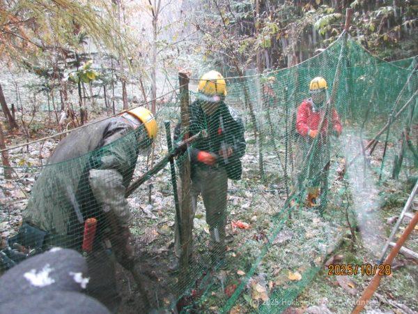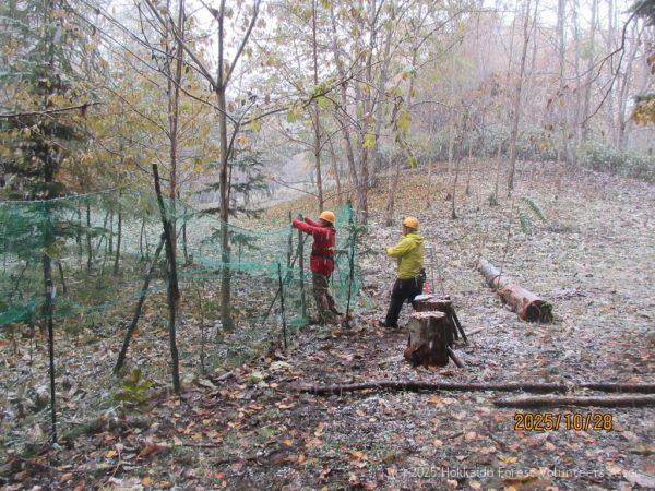 2班に分かれて、中央ギャップ地にある防獣網の補修作業と防獣網内の成長調査を実施しました。が、調査の方は既に葉が無く樹種が特定できない樹木が多く記録帳も濡れて記入出来なくなり途中で断念。避難小屋の屋根用テントを外して回収し、11時過ぎに活動終了となりました。