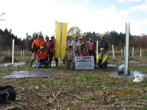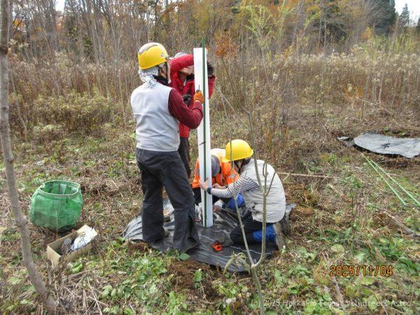 爽やかな秋晴れの中、当初澄川の予定を変更して先月12日に実施した親子植樹祭で植えきれなかった残りの植樹を行ないました。先月30日に防草シート無しで植えた針葉樹35本の植栽個所へシートを敷設。残っていた広葉樹40本の苗木を植え、防草シート、ハイトシェルターを取り付けて植樹が完了しました。