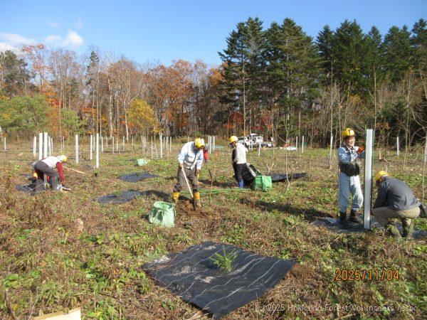 爽やかな秋晴れの中、当初澄川の予定を変更して先月12日に実施した親子植樹祭で植えきれなかった残りの植樹を行ないました。先月30日に防草シート無しで植えた針葉樹35本の植栽個所へシートを敷設。残っていた広葉樹40本の苗木を植え、防草シート、ハイトシェルターを取り付けて植樹が完了しました。