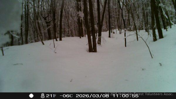 雪はかなり減って作業道の行き帰りはスノーシューが無くても問題が無さそうですが、山の斜面では有った方が良い程度になりました。