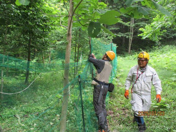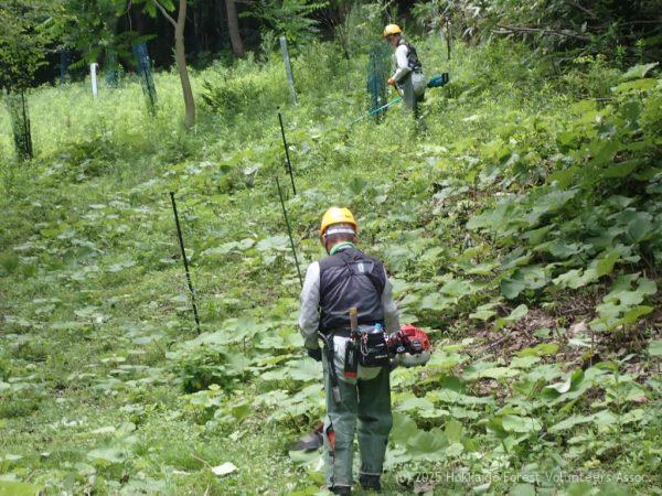 今年2度目の活動は、終日曇り空で湿度も高めでしたが連日の暑さも一休みして風もあり気持ちの良い活動日となりました。参加者5名とちょっと寂しい状況でしたが、シラカンバの倒木処理、植栽地の下草刈り、防獣網内の樹木枝切・網の補修等々の作業を元気に行いました。