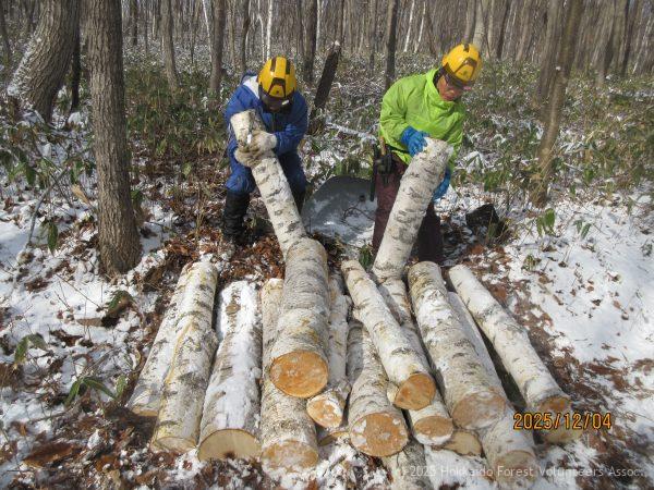 集材では玉切りした丸太を作業道まで運び出すほか、手ノコで切りそのまま放置されている木を小さく切り片づけています。