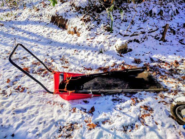 資材移動には前回活動時に加工された獲物搬送ソリにチルホール、ワイヤー等重たい物を乗せ運びました。滑りがよく先頭にスノーダンプを組み合わせているため、操作性にも優れていました。