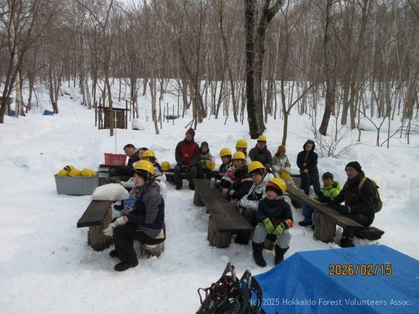 コースは小屋前の集合場所でスノーシューを履き上流橋を渡り、A-2区から中流橋を渡り集合場所に戻る1キロ程度のコースですが、動物の足跡、糞、冬芽から虫や鳥などの説明と質問や回答が有って約1時間以上掛けて森の中を周りました。