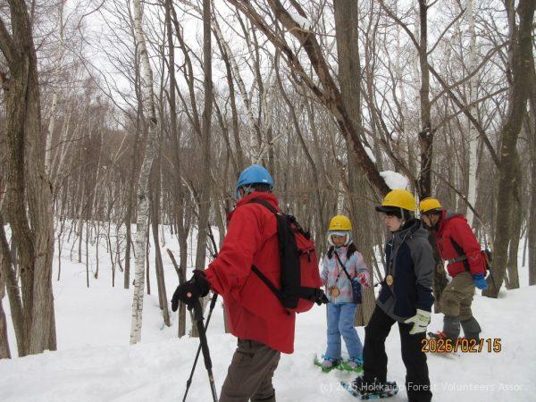 コースは小屋前の集合場所でスノーシューを履き上流橋を渡り、A-2区から中流橋を渡り集合場所に戻る1キロ程度のコースですが、動物の足跡、糞、冬芽から虫や鳥などの説明と質問や回答が有って約1時間以上掛けて森の中を周りました。