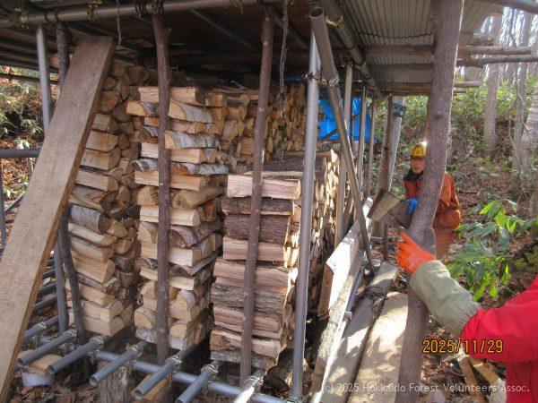 今季最後の昼休憩をはさみ、午後は全員で薪割り 手慣れた連携で薪が積み上がりました。