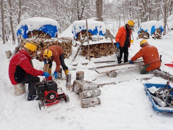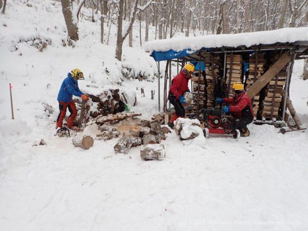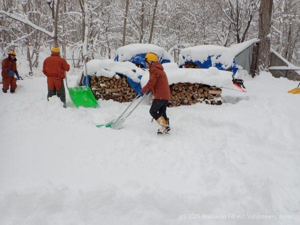 悪天候のため、当初予定していたA-2区の整理伐は取り止め、参加者全員で広場・小屋付近の除雪を行い、その後薪割り作業を実施しました。