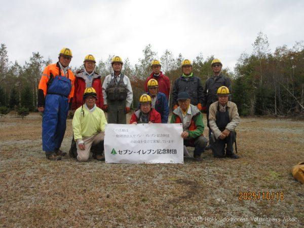 明け方は雨が降っていましたが、ホテルを出る頃(8時30分)には雨も上がり曇り空でした。この日も12名の協会員が参加して烏柵舞で3区1,7,9列の捕植とチャランケ広場のマツ捕植、記念樹の点検を行いました。