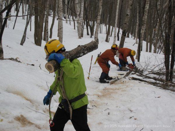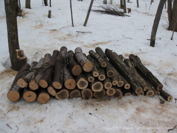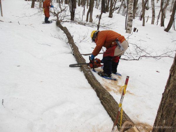 協会員13名とコモド会員2名が参加して、A-2区・E-2区の整理伐とイタヤカエデ3本に樹液採取用器具の取付作業を行いました。