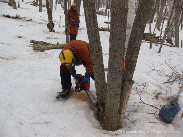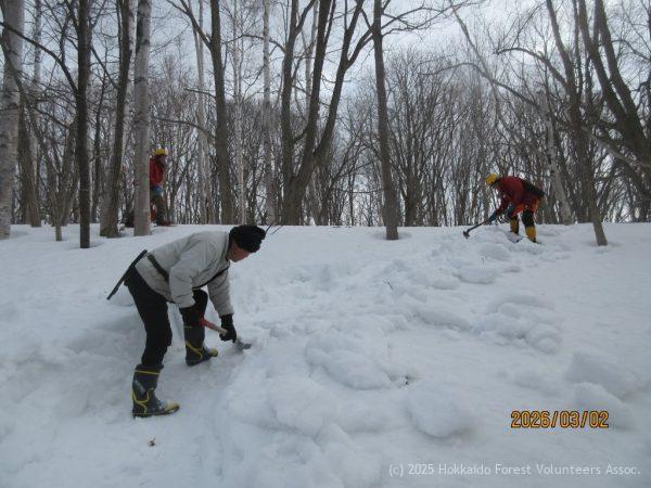 日差しが無く気温は低めで強めの風が吹き真冬のような寒さを感じながらの活動日となりました。協会員9名が参加し、A-2区の整理伐、チェンソー3台の整備、親子用のソリコース作成等の作業を行いました。