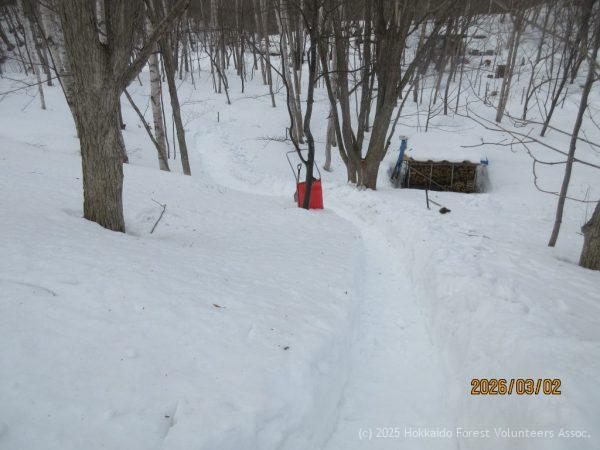 日差しが無く気温は低めで強めの風が吹き真冬のような寒さを感じながらの活動日となりました。協会員9名が参加し、A-2区の整理伐、チェンソー3台の整備、親子用のソリコース作成等の作業を行いました。