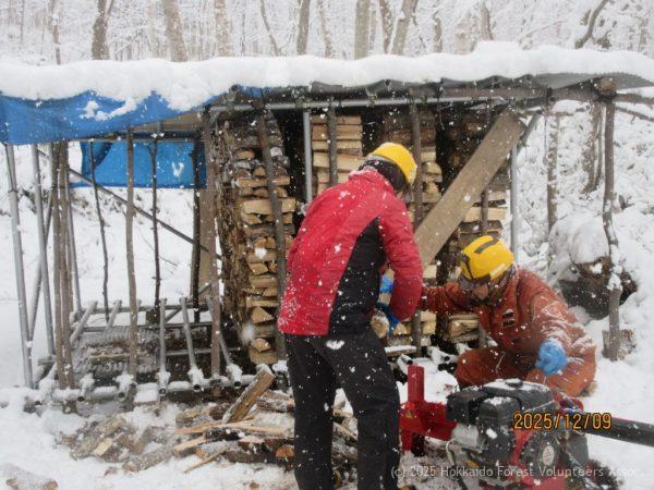 ・薪作り班:5名 薪割り機を使って薪作り、薪小屋へ棚積み