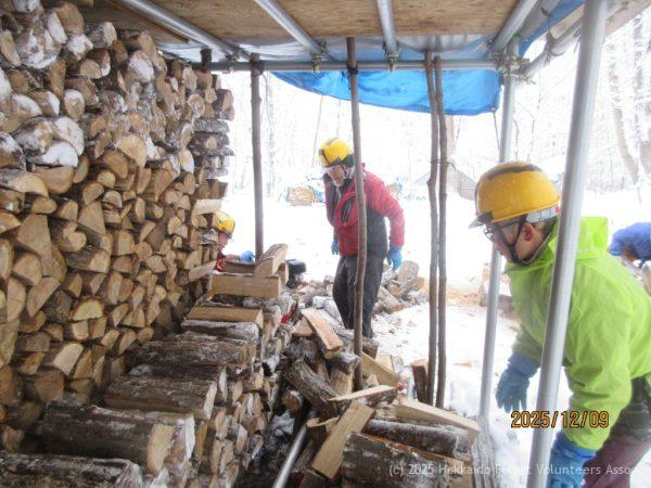 ・薪作り班:5名 薪割り機を使って薪作り、薪小屋へ棚積み