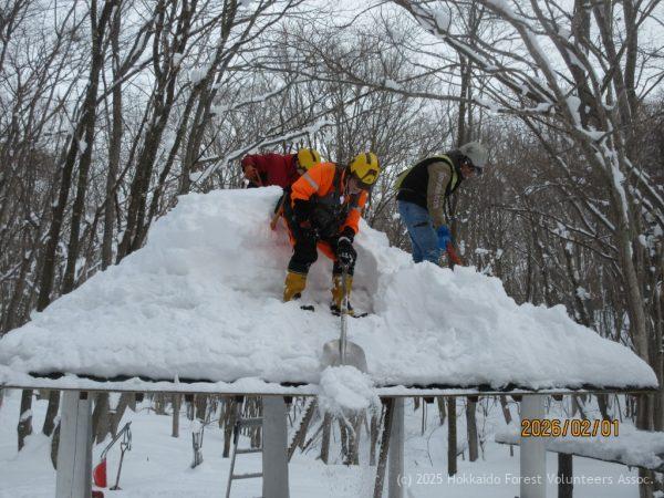 整理伐班はA-1区へ移動して前回の整理伐で残った掛り木の処理を行い、除雪班はE地区の避難小屋へ向かい屋根の雪降しと付近の除雪、上流橋付近の除雪を行いました。