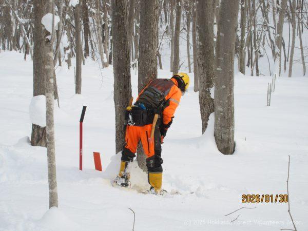 大雪後の整理伐に12名の協会員が一列に雪を踏みしめ道を作りながらA-1.E-2区へ向かいました。街中に比べ森の中は積雪が少ないようで樹間の斜面を昇降する際も雪に埋まらず動けました。