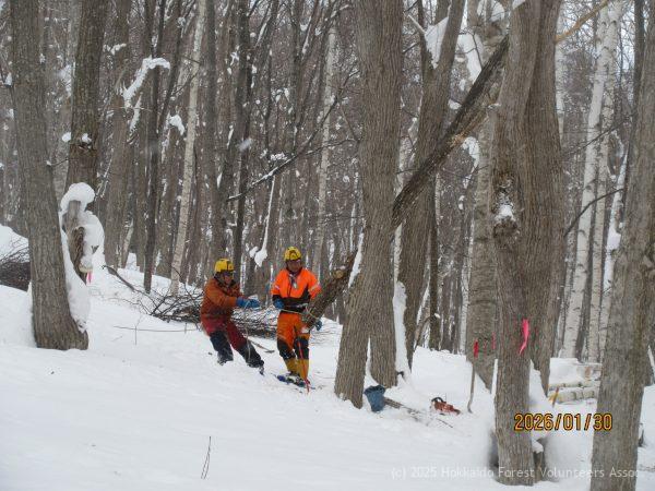 大雪後の整理伐に12名の協会員が一列に雪を踏みしめ道を作りながらA-1.E-2区へ向かいました。街中に比べ森の中は積雪が少ないようで樹間の斜面を昇降する際も雪に埋まらず動けました。