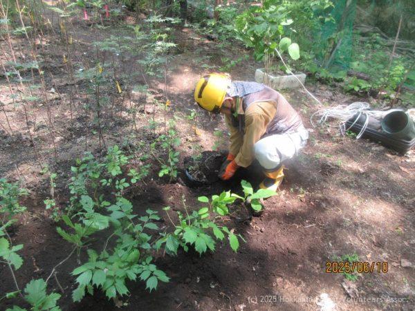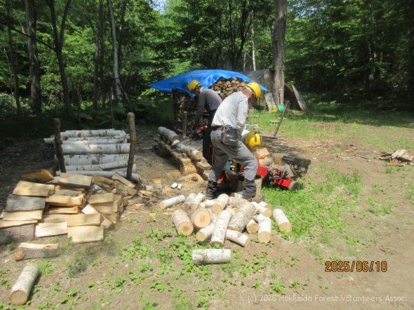 会員13名と体験の方1名が参加して、午前中は市道北側と南側に分かれて清掃活動と10月に予定しているチェンソー安全講習の場所確認、午後からは薪づくり、苗畑整備、支笏湖遠征・親子森林教室の準備などを行いました。