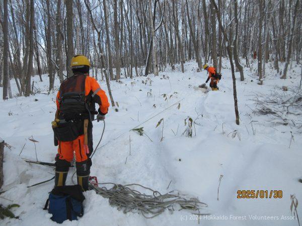 大きな材はロープウィンチを使い、ほだ木用の材はロープを使って人力で斜面を下ろします。雪が積もったおかげで材はするすると滑り降りてきますが、重い自分の体を斜面の上まで繰り返し運び上げる作業が一番の重労働でした。