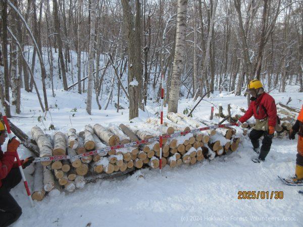 E-8区で続けている整理伐は伐倒と集材をほぼ同時に行い、そのほかにまだ斜面に残されていた材もすべて作業道まで引き下ろし、長さを揃えて用途別に積み材積を測りました。