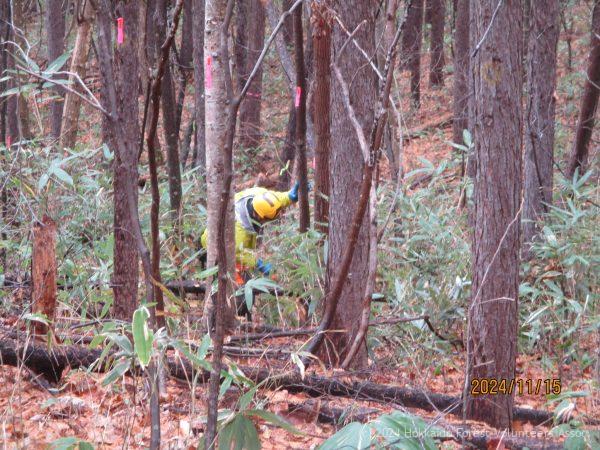 ・選木 F-4区山側で整理伐予定の約70本を調査・選定。枯れたカラマツが大半です。今年延伸した作業道の近くまで迫っています。
