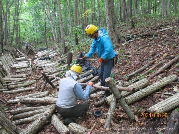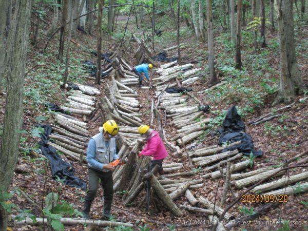 B班はホダ場の整備。D-1区ではホダ木の天地返しと崩れ掛かった棚の付け替えを行いました。キャリコ橋付近(ナメコ)は棚が古くなっていたため地伏せにしました。
