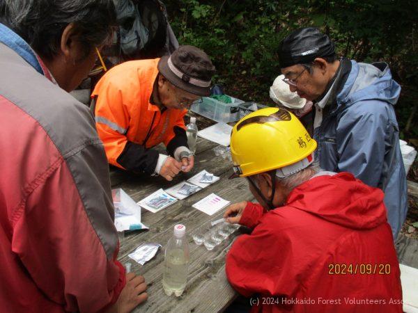 A班は建設環境研究所の酒巻さんにも参加いただいて水質調査を実施。今年度3回目で最終回、上流・キャリコ橋・最下流の3カ所の調査と源流の鉄分調査を行いました。