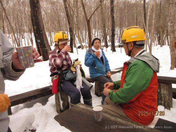 F地区の新設作業道を確認に行きました。材搬出作業車が通り圧雪されていたため、かんじき無く歩くことができました。計画の最終地点 澄川南小マイツリー地を経てF-4地区へ迂回するすべての作業道が開通していました。