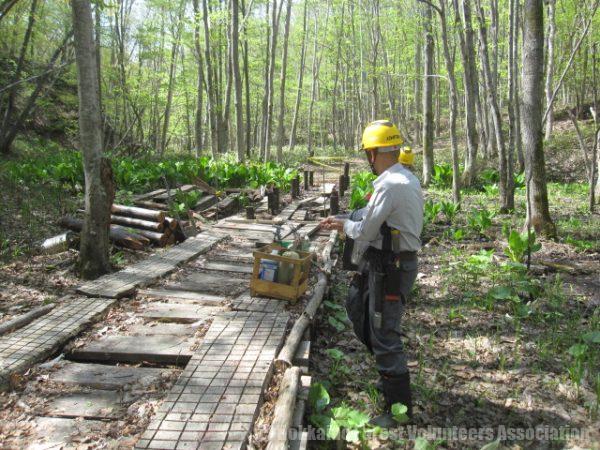 ③木道整備は現地での杭打ち・墨出し・切断が終了しました。進捗状況は予定通リで順調だそうです。