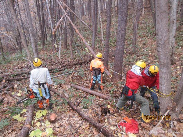・整理伐 F-2区で整理伐を行いました。上部にブドウつるが絡み倒しにくいカラマツがありましたが、23本の木を伐倒しています。