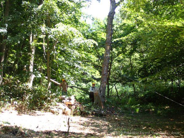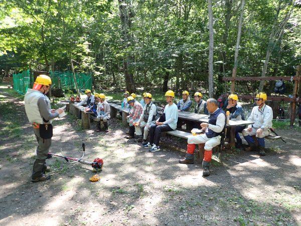 早坂さんが講師を務め刈払機の基本操作講習のあと、矢野さんによる枯れたハンノキをチルホールを使い伐倒処理講習。日ごろの活動の中で遭遇する疑問など、活発な意見交換が行われました。