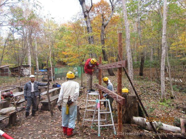 ・小屋前広場の荷物かけの補修 支柱交換、薪小屋の庇延長しています。