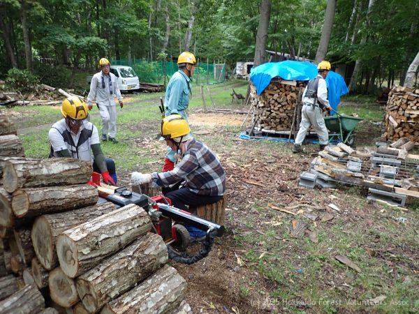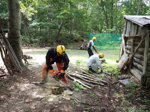午前中は2班に分かれてホダ木を移動し本伏せする班と澄川南小学校のマイツリーに使う杭を作製(スペアを含めて13本)する作業を行う班です。